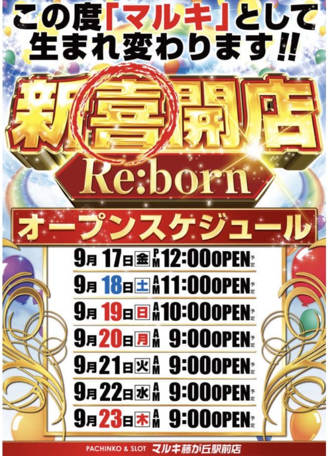 マルキ藤が丘駅前店は9/17(金)12:00にグランドオープンします。 スポンサーリンク 基本情報 マルキ藤が丘駅前店(ピーワールド) 総台数249台(パチンコ台215台、スロット34台) 営業レートは4円パチンコ、1円
